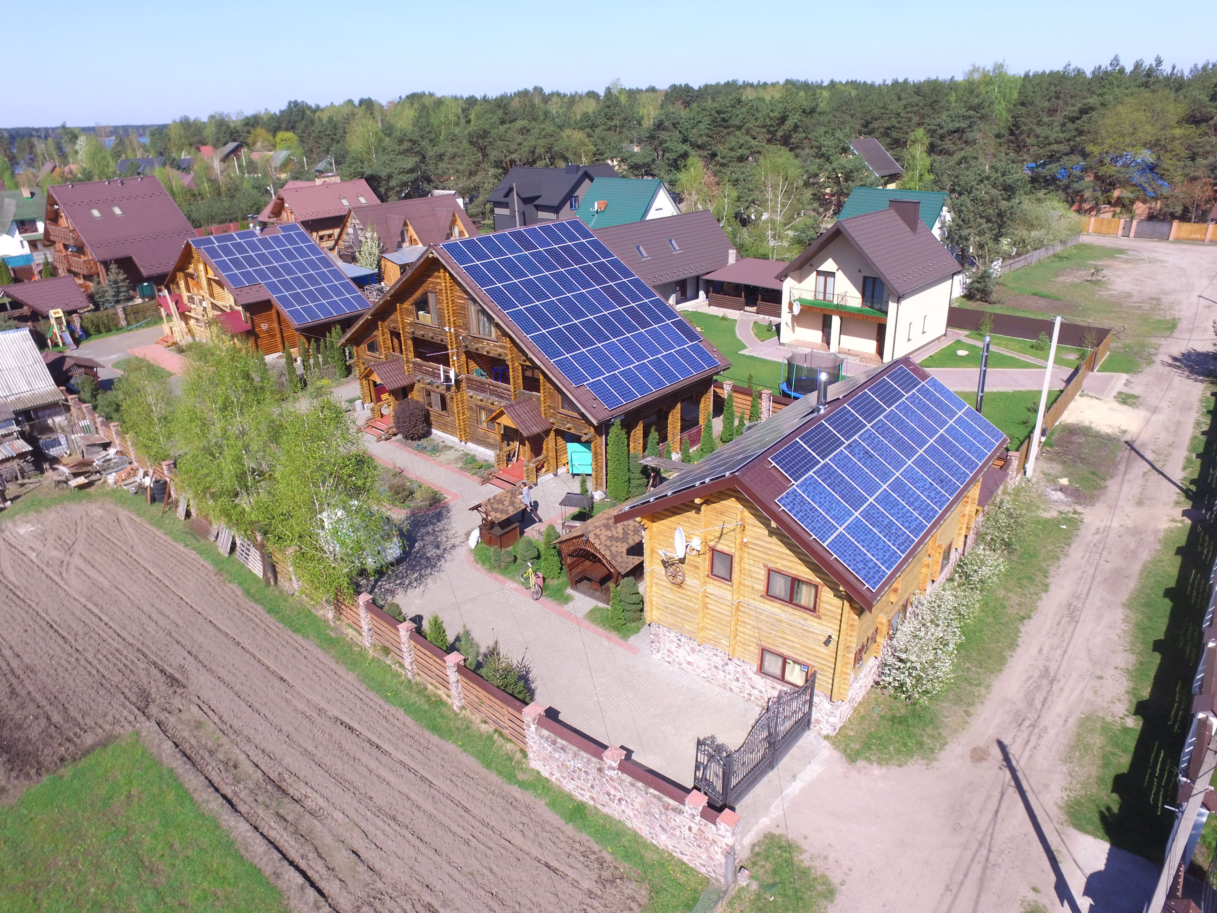 - Паралельно із мережею без акумуляторних батарей. У мережевих сонячних станціях відсутні акумулятори. Це зменшує їхню ціну, але користувач повністю залежить від роботи мереж обленерго. Вдень надлишок виробленої із сонця електрики продається за зеленим тарифом державі, що вночі споживається на звичайних умовах. Встановлення є доцільним, якщо основна потреба в енергії припадає на денні години (як в офісах). Влітку така система приносить прибуток, узимку дозволяє заощаджувати витрати.